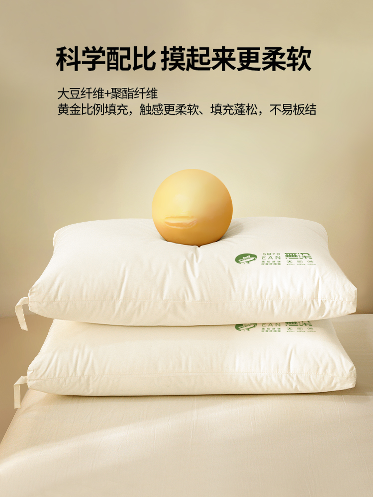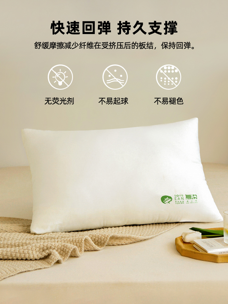 A類面料,無熒光劑,不易起球,不易褪色,大豆纖維填充,枕頭Q彈,陷在柔軟中,擠壓不易變形。