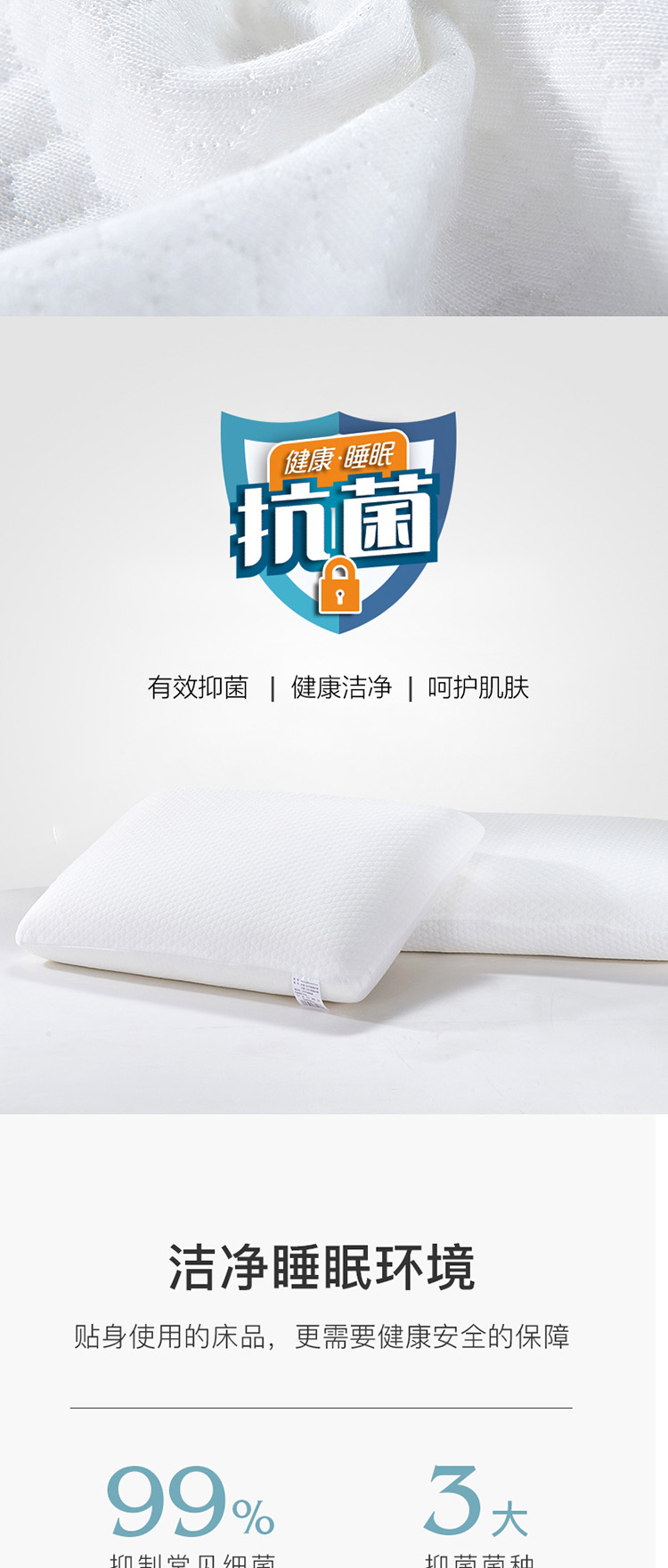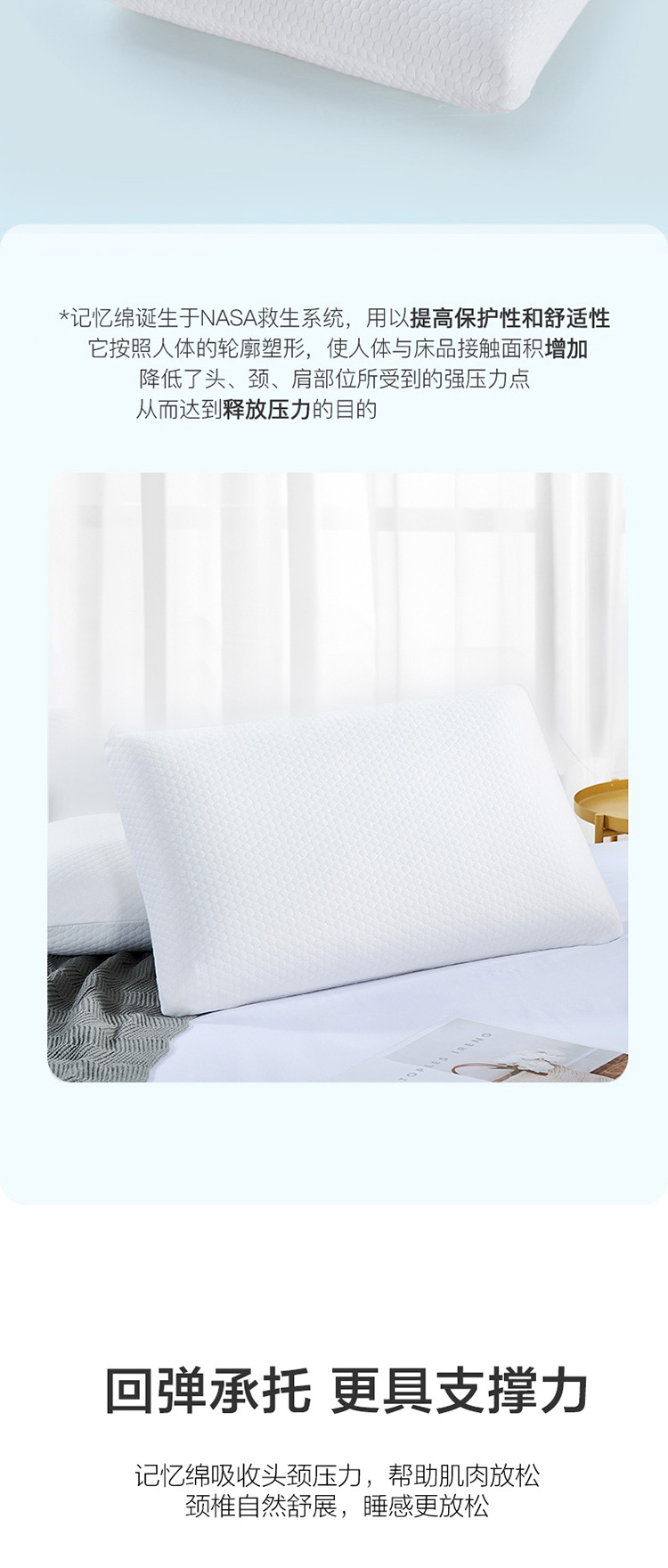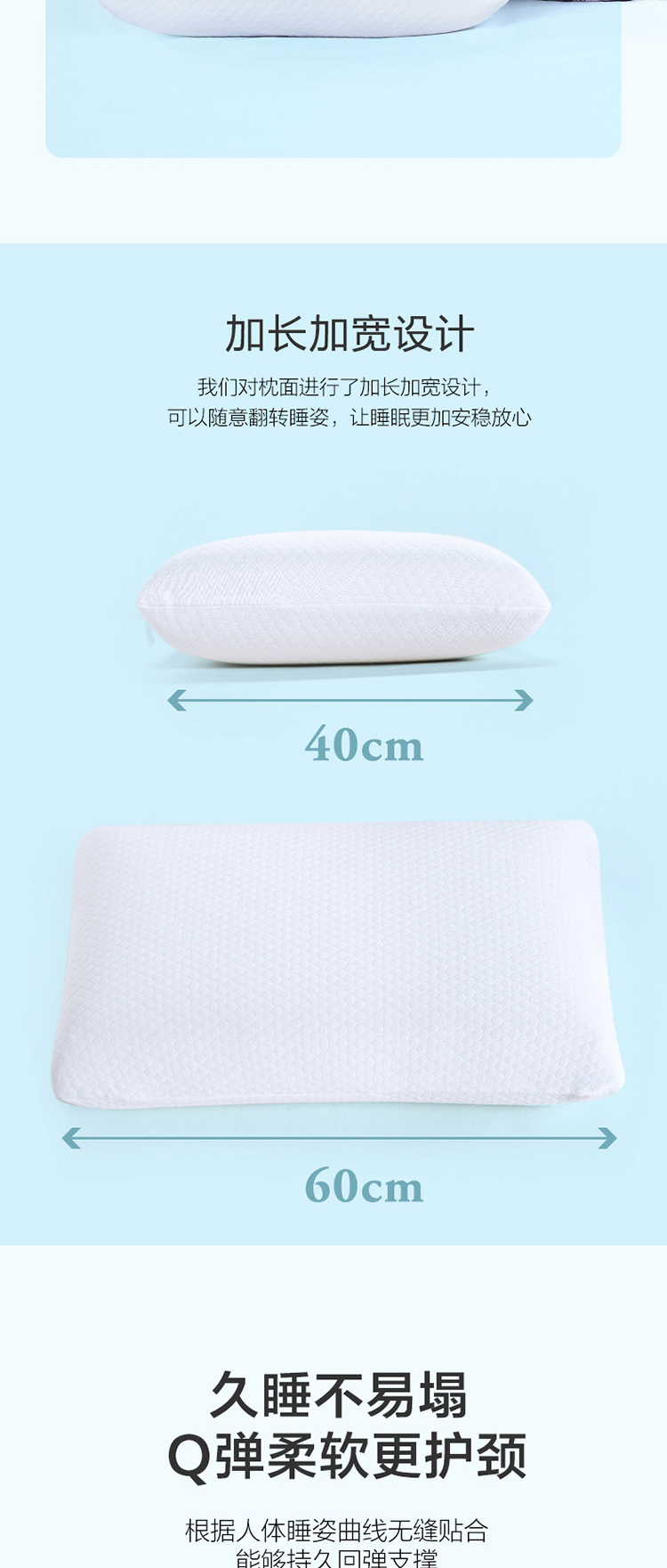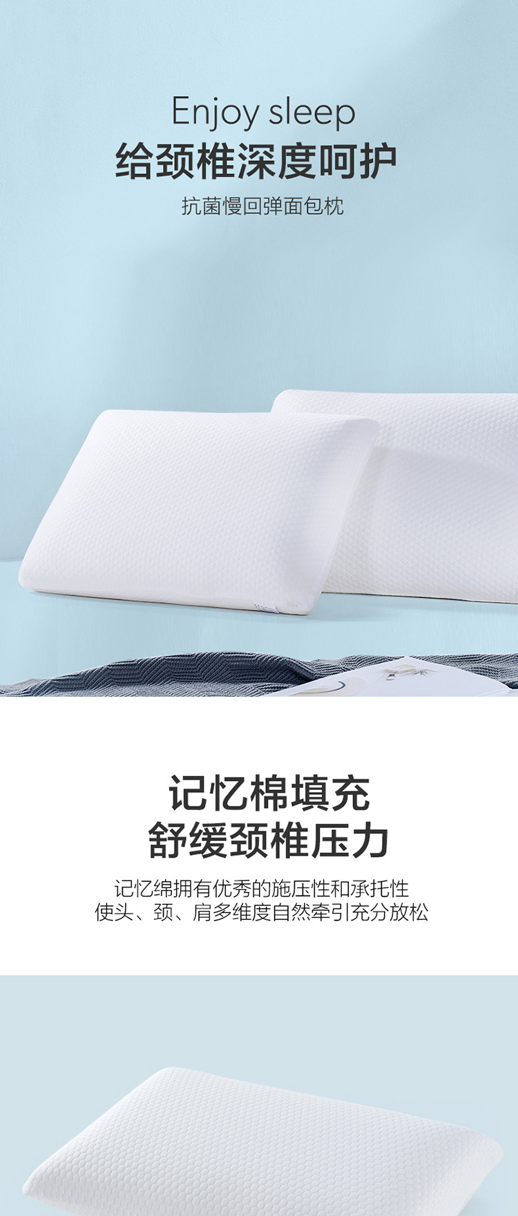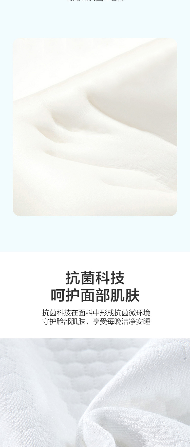 貼合肩頸,舒緩肩頸有效支撐,加寬枕面,隨意翻動各種睡姿,慢回彈久睡不易塌,抗菌科技,有效抑菌潔凈健康。